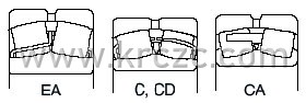调心滚子轴承,如图所示,有高负荷容量设计的EA型,C型,CD型,CA型。设计上, EA型,C型,CD型 为冲压保持架, CA型为铜合金车制保持架。EA 型轴承具有高负荷容量,低转矩的特长。